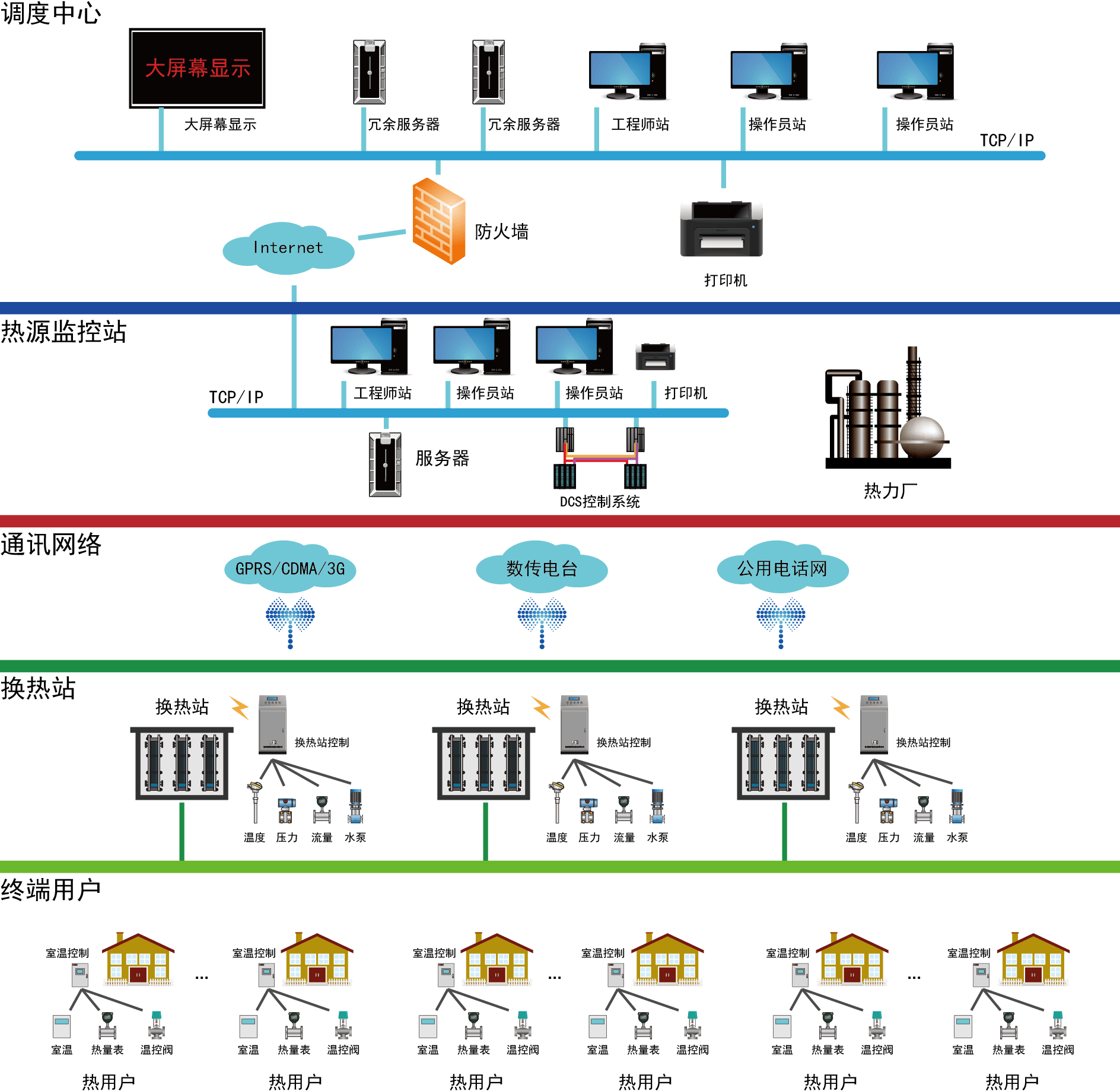 城市集中供热系统一般包括热源厂、换热站、热管网和热用户四个环节。其中热源厂是整个热循环系统的热能产生环节,换热站是热能转换环节,热管网是热能运输环节,热用户是热能使用环节。